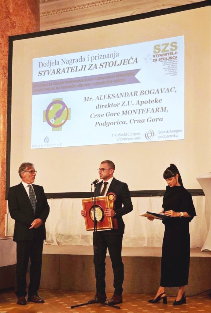 Direktor ZUACG MONTEFARM, MApp Aleksandar Bogavac, nagrađen je prestižnom međunarodnom nagradom „Stvaratelji za stoljeća“ za profesionalizam u javnom sektoru u srednjoj i jugoistočnoj Evropi. Nagrada mu je uručena tokom V Svjetskog kongresa preduzetnika u Sloveniji, održanog sredinom oktobra 2025. godine.